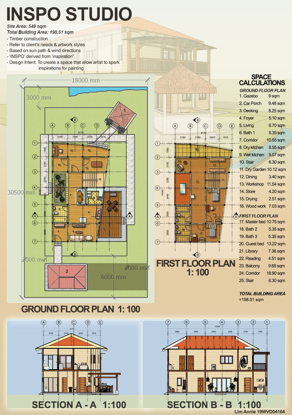 Inspo Studio is a two storey retreat studio that mainly constructed by timber. Its total building area is about 199 sqm. The design intent is to create a space that allow the artist to spark inspirations for her painting.