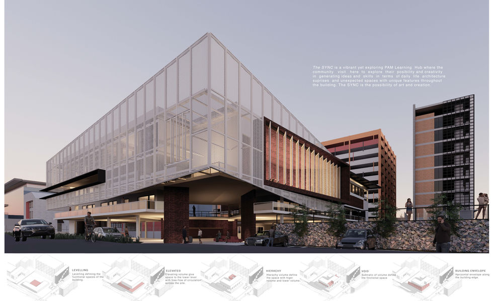 The SYNC is a PAM Learning Hub which cater all purpose group from the community in order for them to experience and get to know about the perception of the REAL Architecture. The SYNC provides wide exposure to the building users where it performs as a 3D catalogue for the users to have experience along the building circulation. Various functional spaces are provided among different floor levels to cater various usage while connecting the levels together with linkage creating a looping circulation along the building.