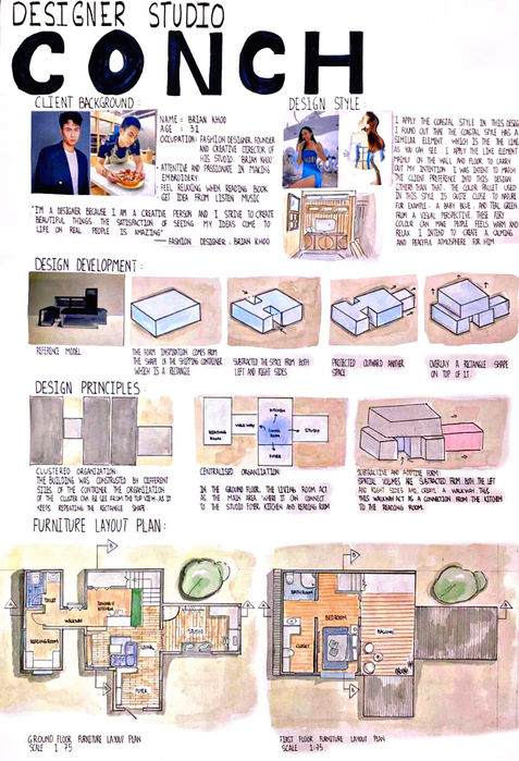 The Conch is constructed using the structure of a shipping container to design a compact living space for a fashion designer. With the growth of urbanization, there are more high-rise buildings to fulfill the demand of people in the city. In recent years, compact living is gaining popularity. It is the design of a small yet functional living space. This project is called The Conch. The shell is the shelter of a conch. Although it is small and compact, it can protect the conch.